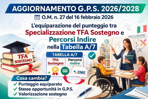 Aggiornamento G.P.S. 2026/2028 (O.M. n. 27 del 16 febbraio 2026): l’equiparazione del punteggio tra specializzazione TFA sostegno e percorsi Indire nella Tabella A/7