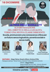 52esima puntata La Voce della Scuola LiveScuola, promuovere una conoscenza critica per un futuro senza ingiustizia, povertà sociale e senza mafie”.Nell’anno 2022 ricorreranno il 40° anniversario dell...