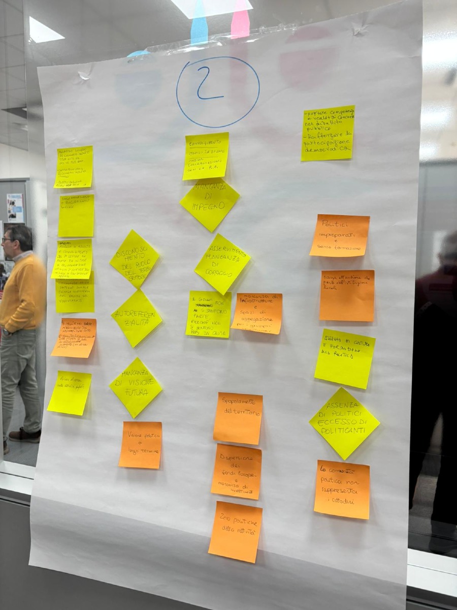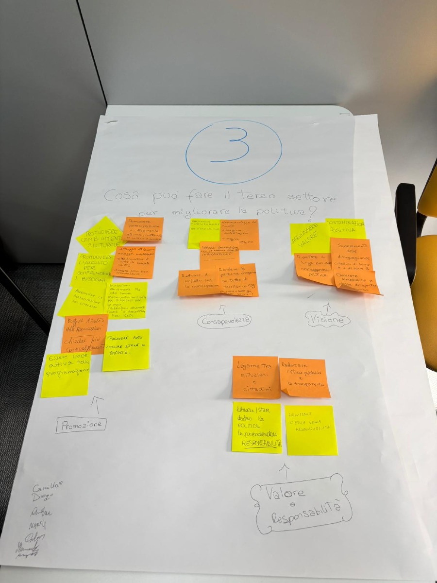 Attraverso il lavoro di gruppo, i partecipanti sono stati invitati a riconoscere le forme – spesso implicite – di azione politica già in atto: dalla capacità di intercettare bisogni emergenti, al ruolo di mediazione sociale, fino alla costruzione di reti e alle pratiche di partecipazione nei processi decisionali locali. Allo stesso tempo, è emersa la necessità di affrontare criticità ricorrenti, come la frammentazione del Terzo settore, la difficoltà di incidere sulle agende politiche e il rischio di una partecipazione solo formale.