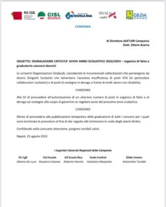 Campania, sindacati: "Segnalazione criticità avvio anno scolastico, organico di fatto e graduatorie concorsi docenti"