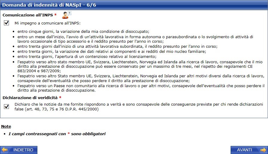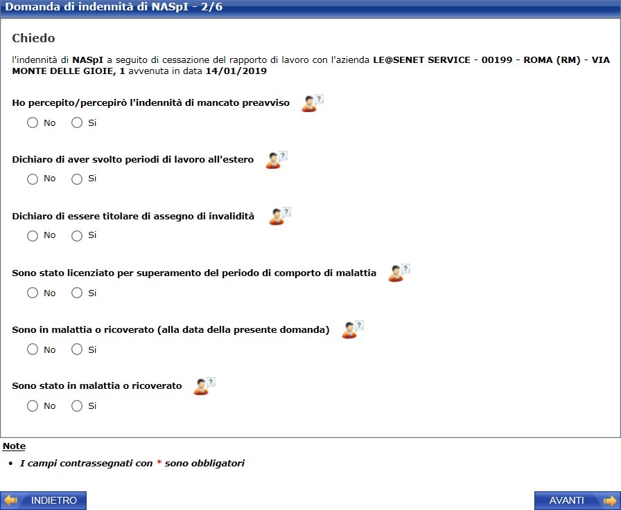 Per compilare la domanda spunta NO oppure SI in risposta alle domande elencate nella maschera. Assicurarsi di verificare con cura le dichiarazioni rese. Un errore di dichiarazione può rallentare l’erogazione dell’indennità.