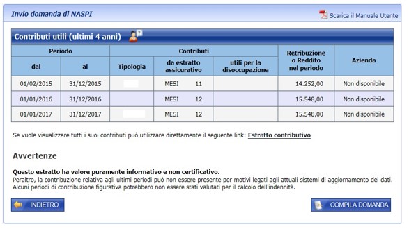 In questa sezione è possibile verificare il riepilogo dei mesi di contribuzione relativa al tuo lavoro degli ultimi quattro anni, utile per la NASpI.