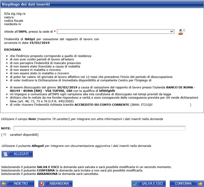 In questa illustrazione dimostrativa, è possibile visualizzare il riepilogo dei dati inseriti. È possibile inoltre, se si ha necessità, di aggiungere allegati. Cliccare SALVA ED ESCI per competare la domanda in un secondo momento, oppure cliccare CONFERMA, per inviare correttamente la domanda.