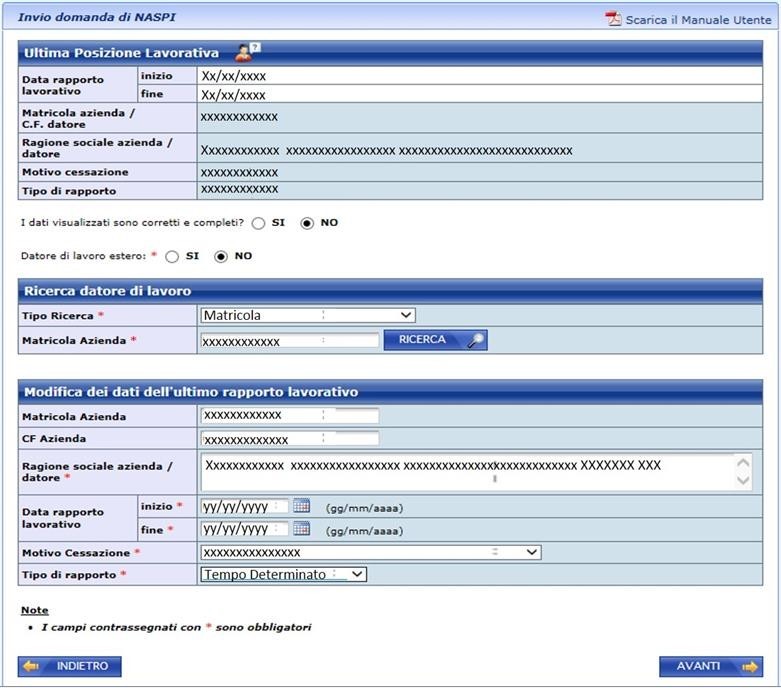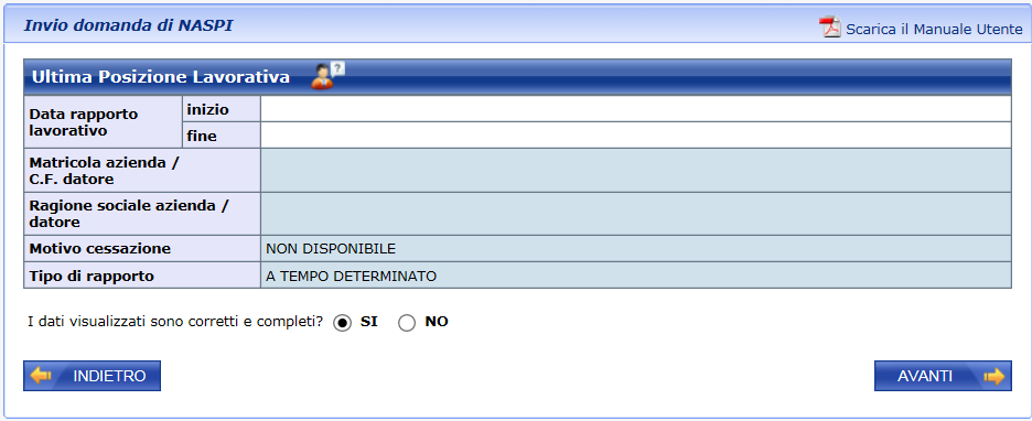 Se i dati già inseriti non sono corretti, spuntare NO sotto alla tabella e inserire manualmente i dati dell’ultimo datore di lavoro e dell’ultimo rapporto di lavoro. Dopodichè, cliccare AVANTI.