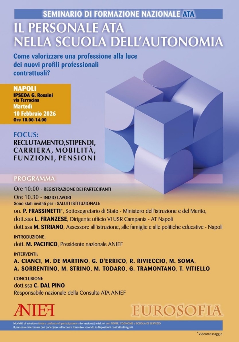 Martedì 10 febbraio 2006, dalle ore 10:00 alle ore 14:00, presso L’Ipseoa G. Rossini, via Terracina a Napoli, ci sarà un importante seminario di formazione nazionale: “Il personale ATA nella scuola dell'autonomia: come valorizzare una professione alla luce dei nuovi profili professionali contrattuali?”. Il focus sarà: reclutamento, stipendi, carriera, mobilità, funzioni, pensioni.
