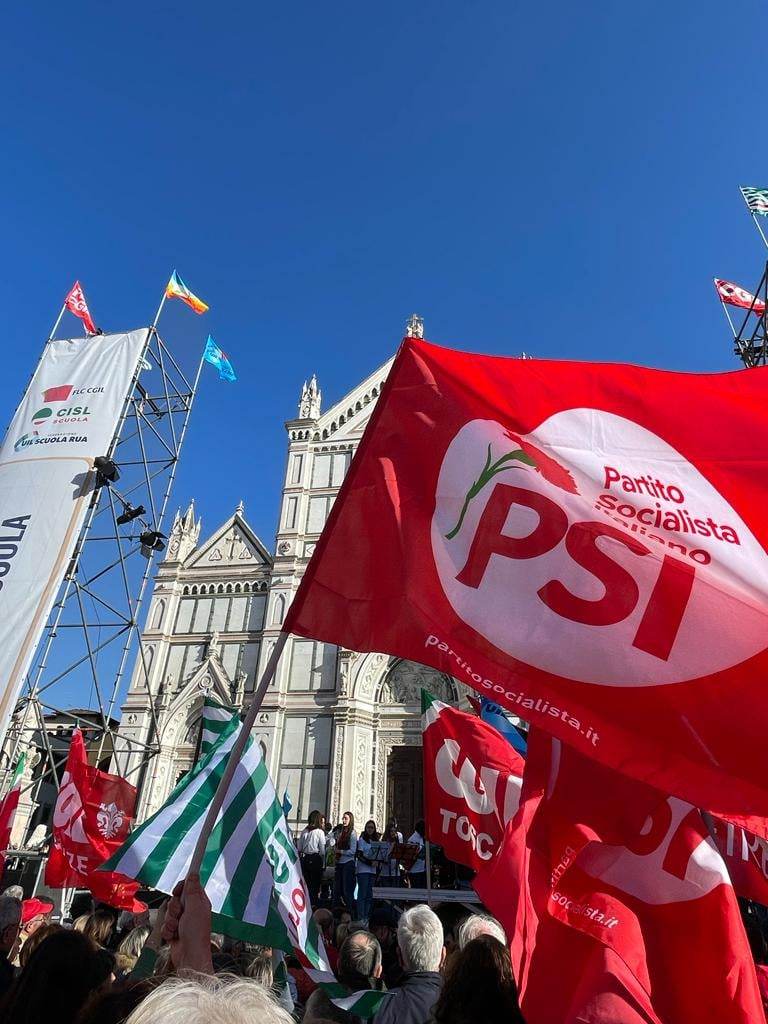 Una delegazione del PSI guidata dai compagni Dal Ciondolo, della Segreteria nazionale, Fantò, Responsabile scuola e università, e Folli Segretario metropolitano, ha partecipato ieri alla manifestazione organizzata a seguito dell’appello lanciato dalle RSU delle scuole di Firenze e organizzata da CGIL, CISL e UIL in difesa della scuola pubblica e della Costituzione. Le reazioni del Ministro Valditara seguite all’aggressione squadrista ai ragazzi del liceo “Da Vinci” e alla lettera della Dirigente del liceo “Michelangiolo”, insieme alle esternazioni e alle azioni degli altri Ministri, danno la cifra di un governo che sta dimostrando con implacabile coerenza la propria matrice reazionaria.