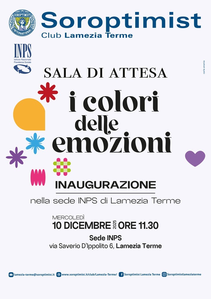 Lamezia Terme, 8 dicembre 2025 – Tutto pronto per l’inaugurazione della Sala d’Attesa per bambini “I colori delle emozioni” realizzata dal Soroptimist Club di Lamezia Terme nella sede INPS in via Saverio d’Ippolito 6 a Lamezia Terme.