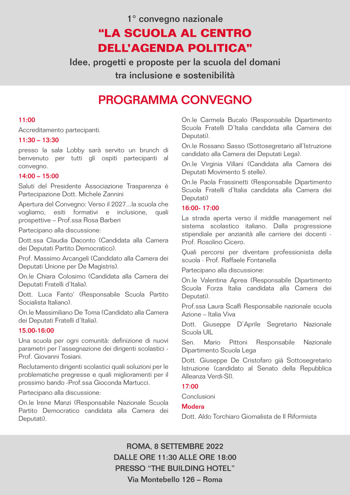 Roma 8 settembre, convegno organizzato dall'Associazione Scuola Trasparenza è Partecipazione: “La scuola al centro dell’agenda politica” per discutere di idee, progetti e proposte per la scuola del domani tra inclusione e sostenibilità"