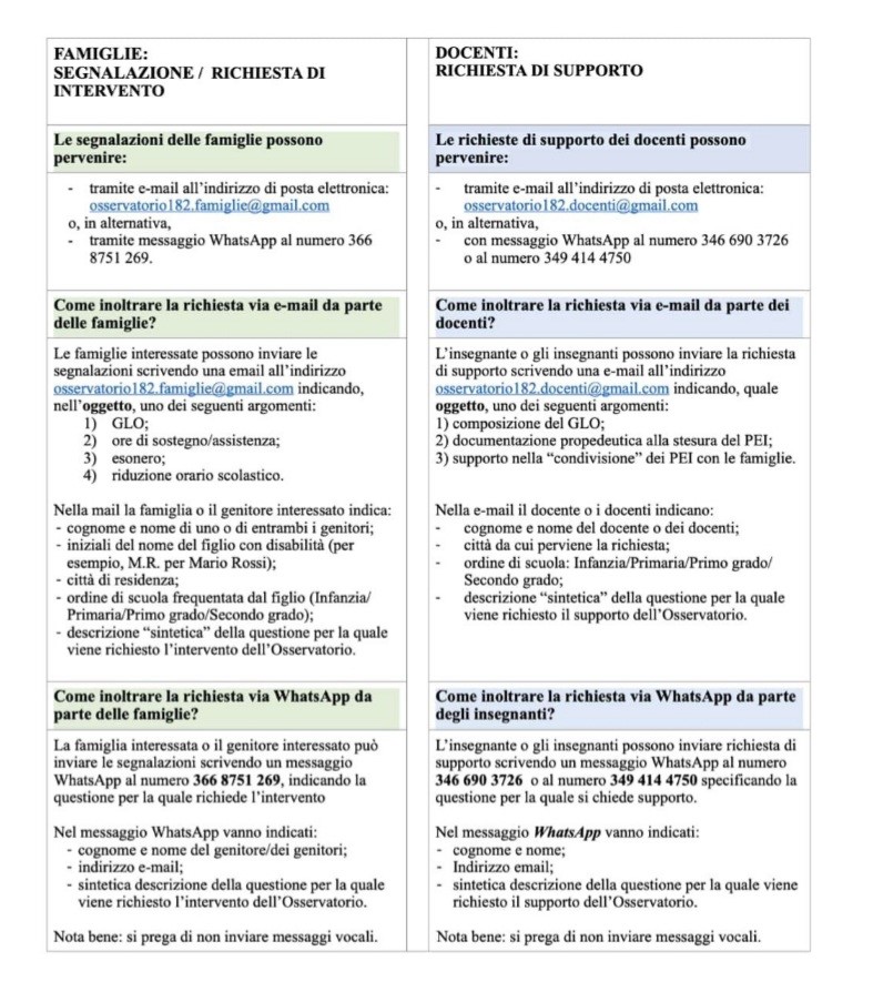 Nello specifico, l’Osservatorio intende offrire il suo supporto in relazione a molte questioni e problematiche irrisolte sul fronte della disabilità a scuola: mancata assegnazione di ore di sostegno didattico e di (eventuale) assistenza specialistica; ore di sostegno (docente) non assegnate o assegnate in numero inferiore rispetto a quanto richiesto dal GLO; ore di assistenza (ad personam / educatore) non assegnate o assegnate in numero inferiore rispetto a quanto richiesto dal GLO; ore di assistenza poste come alternativa a quelle del docente e viceversa.