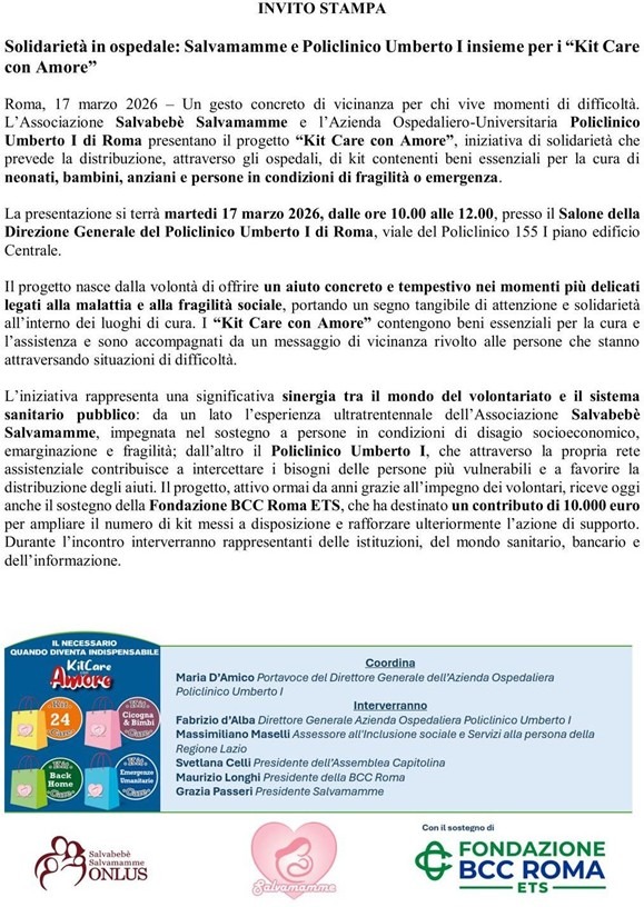 Solidarietà in ospedale: Salvamamme e Policlinico Umberto I insieme per i “Kit Care con Amore”, che si terrà martedì 17 marzo 2026, dalle ore 10.00 alle 12.00, presso il Salone della Direzione Generale del Policlinico Umberto I di Roma