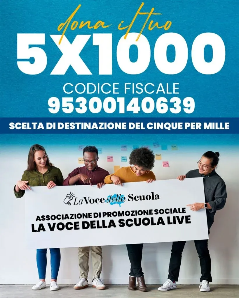 La Voce della Scuola LIVE è un’associazione di promozione sociale senza scopo di lucro che vive grazie all’impegno di volontari e alla fiducia della propria comunità. Destinare il 5x1000 significa contribuire concretamente alla continuità e allo sviluppo del progetto, senza alcun costo aggiuntivo. Allo stesso modo, una donazione liberale rappresenta un aiuto diretto per sostenere le attività editoriali, culturali e di partecipazione che portiamo avanti ogni giorno.