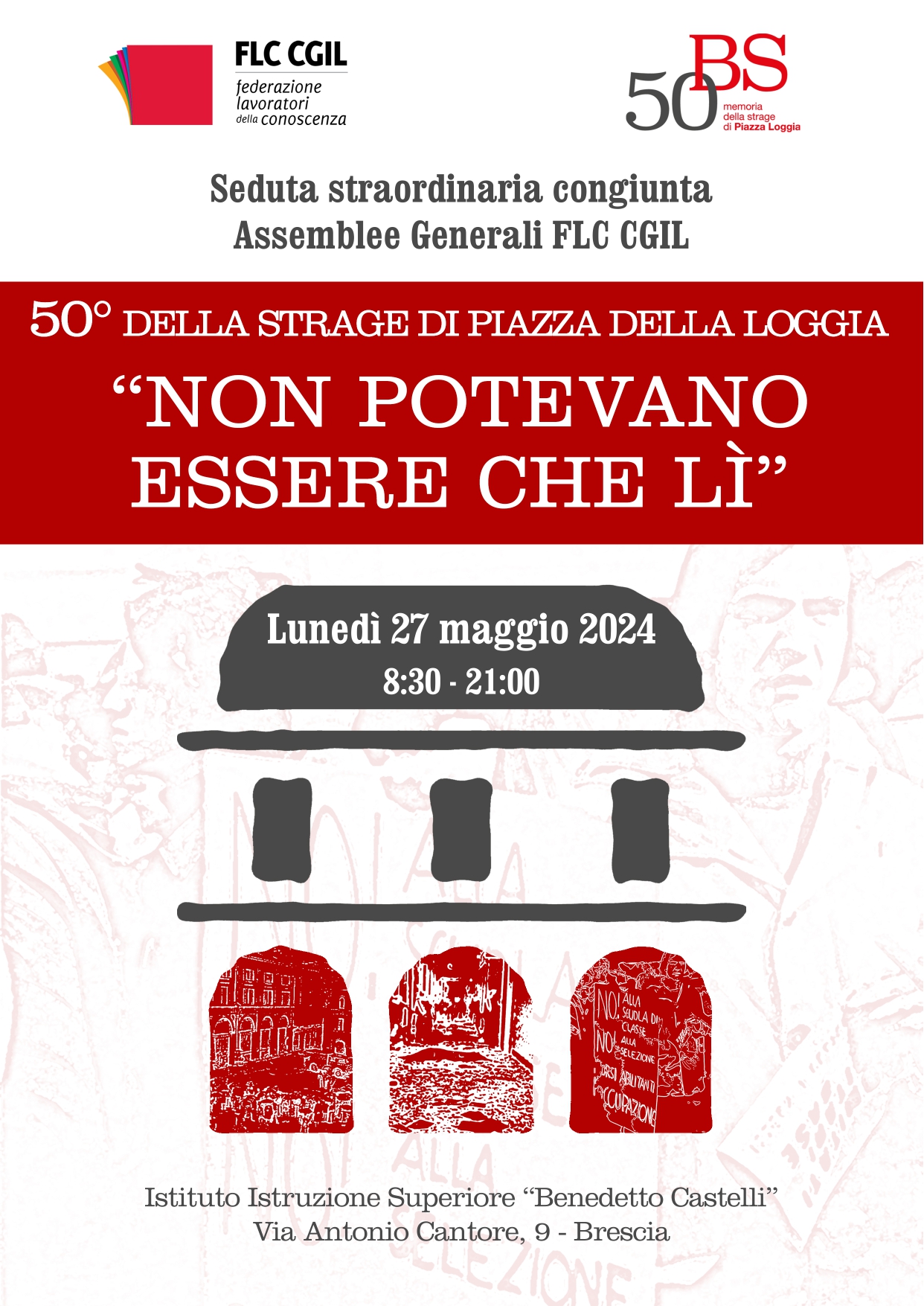 In occasione del 50° anniversario della strage di Piazza della Loggia, in cui 5 insegnanti iscritti all’allora CGIL Scuola hanno perso la vita, le assemblee generali della FLC CGIL – nazionale, della Lombardia e di Brescia – si riuniscono per un’assemblea straordinaria nella giornata del 27 maggio, presso l’Istituto Istruzione Superiore “Benedetto Castelli” di Brescia, per riflettere su un evento storico che ha segnato profondamente la storia del Paese.