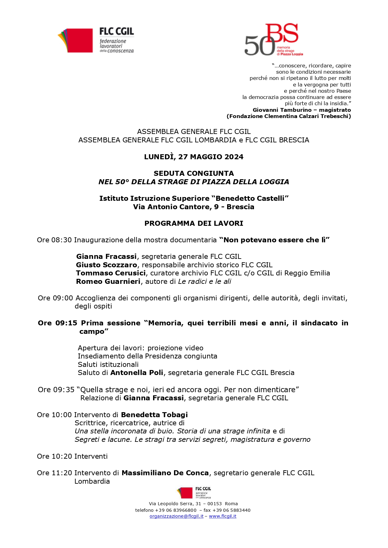 Il giorno seguente, il 28 maggio, parteciperemo alla commemorazione ufficiale in Piazza della Loggia alla quale prenderà parte il segretario generale della CGIL, Maurizio Landini e che vedrà la presenza del Presidente della Repubblica Italiana, Sergio Mattarella.