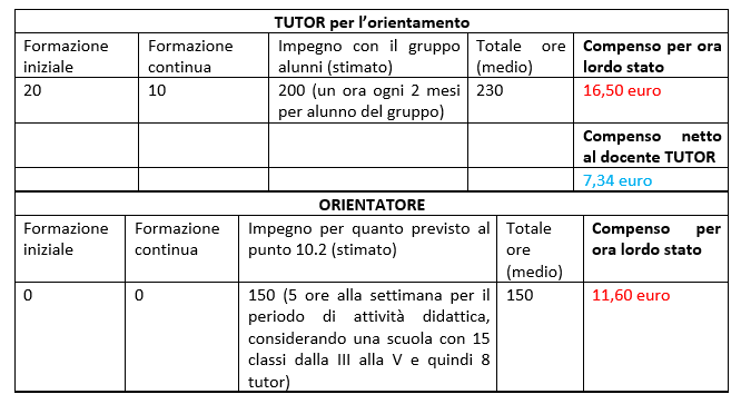 Il dettaglio nella tabella che riporta il calcolo preventivo di quanto potrebbe essere la retribuzione oraria sia del docente TUTOR che dell’ORIENTATORE: