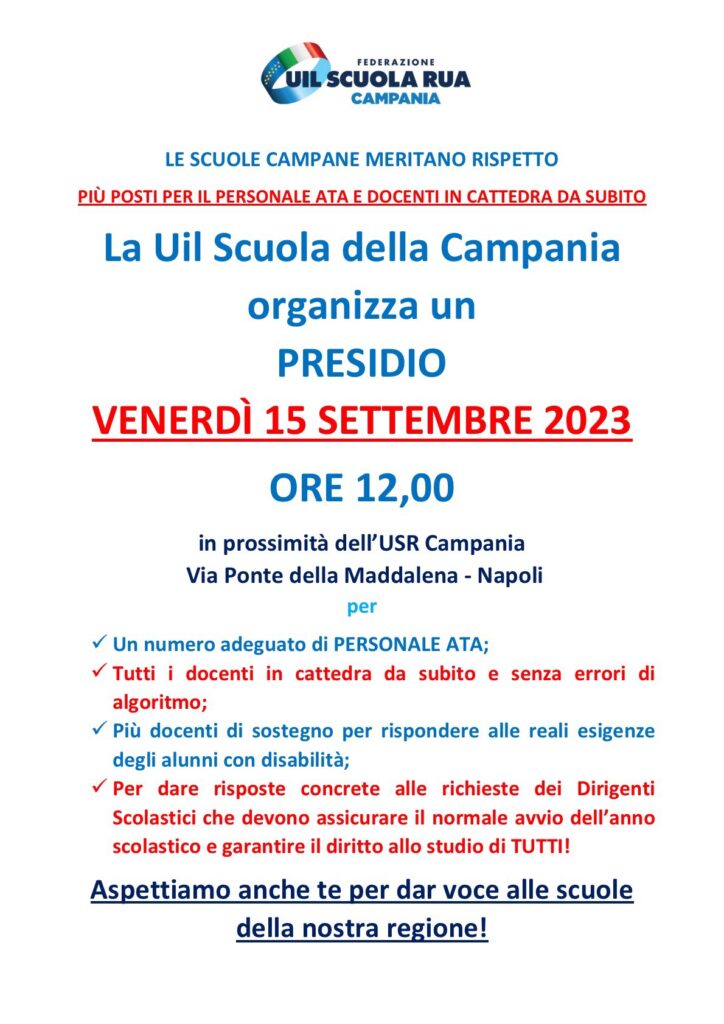 La UIL Scuola Campania ha organizzato un presidio per venerdì 15 settembre alle ore 12:00, in prossimità dell’USR Campania in Via Ponte della Maddalena a Napoli, per sostenere le istanze dei lavoratori e trovare soluzioni condivise con l’amministrazione.